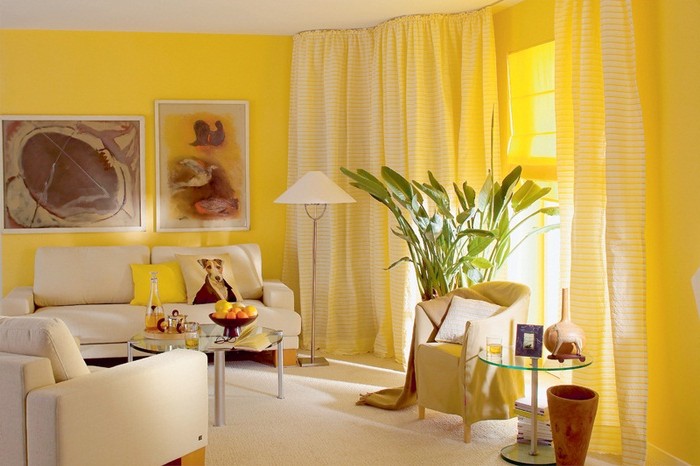 Để nhấn mạnh thiết kế có phần tươi trẻ và rực rỡ. Nội thất phòng khách này được thiết kế với tone màu chủ đạo là vàng. Với thiết kế này, màu tường và nhiều đồ vật màu vàng được phối hợp cùng ghế sofa trắng sữa mang tới sự hài hòa, lạ mắt cho không gian. Nội thất phòng khách chung cư đẹp sẽ mang đến cho không gian căn hộ của bạn thêm rộng rãi và bớt nhàm chán, mẫu thiết kế này thường thích hợp với những cặp vợ chông trẻ. Phong cách này cũng dễ dàng thi công bởi hầu hết chất liệu gỗ được sử dụng là gỗ công nghiệp.